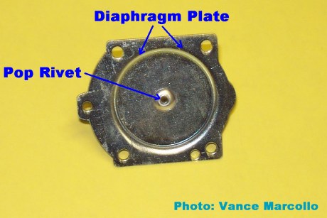 Place this whole assembly between a set of vise jaws with the rivet nail facing up and tap the nail out of the rivet ,being careful that you do not damage anything. Removing the nail gives a breather hole so the diaphragm can work correctly and the spring stops the rivet from rattling around and also, holds it off the diaphragm.