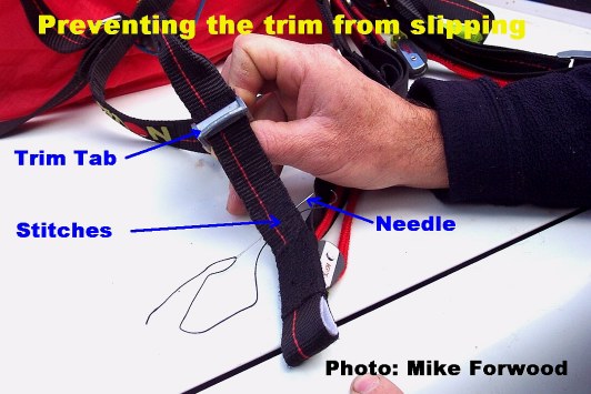 In the picture below, we can see clearly that by using a needle and heavy duty thread and that by threading the needle through the cross section of the webbing, the thread is inside the webbing so does not get worn by the trimmer buckles sliding on it like other fixes that people use .