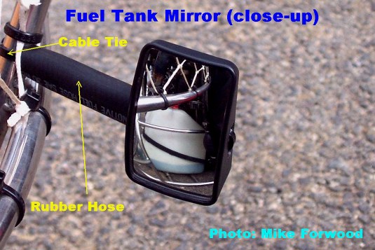Thread the cable tie through the fuel hose. Next , thread the cable tie through the two predrilled orifices in the mirror, back through the rubber hose. This will make a short stand - mount for the mirror.